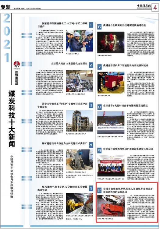 《全国首台柴油机单轨吊无人驾驶机车在304am永利集团杨柳矿试验成功》入选“2021煤炭科技十大新闻”