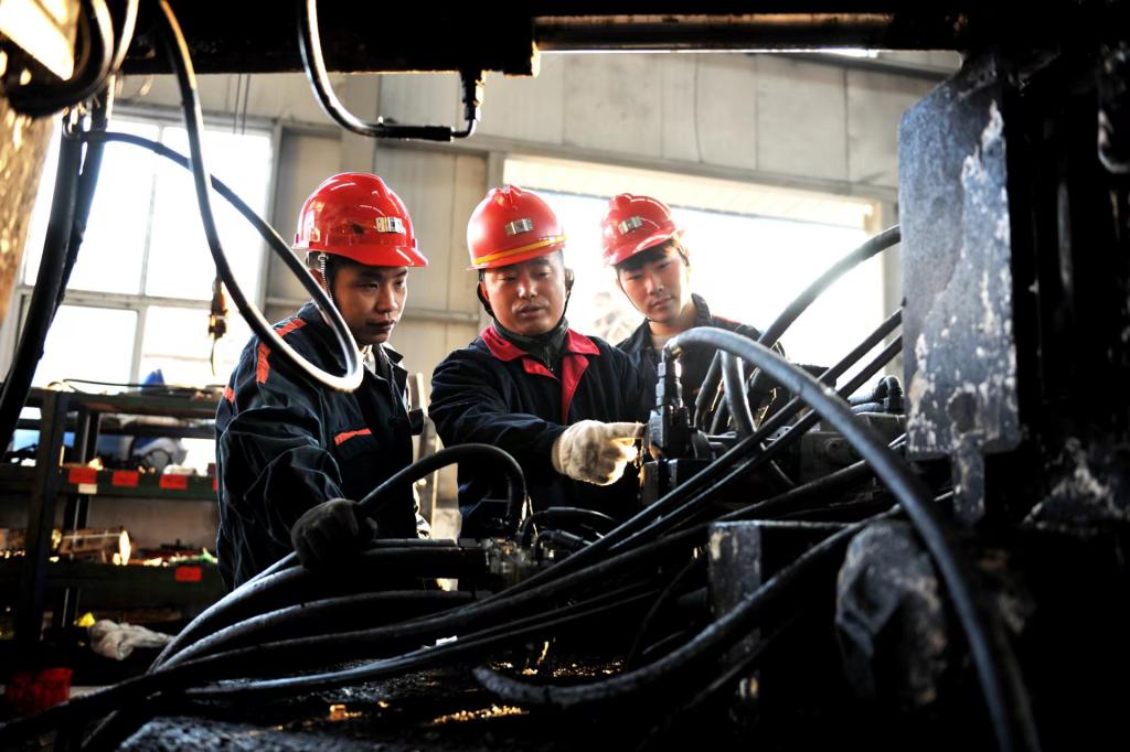 杲志(中间)在为职工讲解钻机维修知识