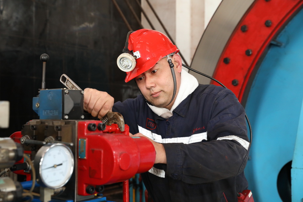 该矿保运区职工宋清杰(左)与工友查验主提升钢丝绳。