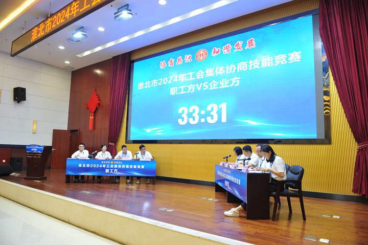 竞赛以“协商共识、和谐发展”为竞赛主题,旨在充分发挥集体协商制度在协调劳动关系中的重要作用,锤炼一支高素质、善沟通、会协商、有担当的集体协商人才队伍,切实提升淮北市集体协商质量,促进劳动关系和谐稳定。此次竞赛汇集了全市各县区、行业工会及304am永利集团、皖北煤电集团、中煤矿建集团、淮海实业集团10支代表队伍,他们围绕职工权益维护、福利待遇等问题,在模拟场景中进行集体协商,由评委组对协商呈现效果进行专业点评。各支参赛队伍围绕“协商共识、和谐发展”活动主题,依据理、法、情,透彻分析案例、准确运用政策、缜密逻辑推理、合理设置身份、流畅配合协作,各抒己见,据理力争,较好展示了参赛队伍的风采,比赛现场气氛热烈,紧张有序。竞赛评定团体一等奖、二等奖、三等奖和个人奖项“最佳协商员”“优秀协商员”“协商能手”,同时设置优秀组织奖。