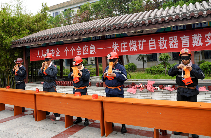 朱庄矿开展“自救器盲戴练兵”活动,确保职工遇到险情时能够快速、准确、安全地使用自救器(张宗风 摄)