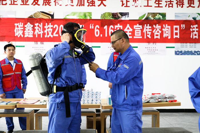 碳鑫科技采取现场教学的模式,对正压式空气器的穿戴使用方法进行讲解,提高职工安全技能(闫旭 摄)