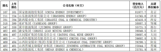从中国上榜煤炭企业看,共有11家企业上榜,较上年净增1家,山西焦煤集团再次进入500强名单。国家能源集团、山东能源集团、陕煤集团继续位列煤炭行业入围企业三甲,兖矿集团超过冀中能源集团位列第四位,且其成为排名上升最快煤炭企业(上升81位)。11家企业中,国家能源集团,晋煤集团位次略有下滑,其余企业排名位次均有所提升。