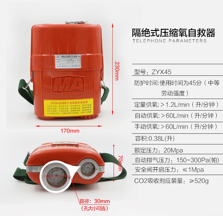 3、清净罐内装入定量的符合标准的CO2吸收剂形成CO2过滤系统。平时所有系统装置都装在壳体之中,使用者能通过上盖上的观察窗清楚地看到压力表的压力指示。在下壳上设有皮带孔和背带,使用者可固定在矿工皮带上或挎在肩上。4、供氧方式有以下三种: